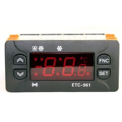 Контроллер Elitech ETC-961 предназначен для управления работой статического воздухоохладителя, камерой охлаждения со статическим охлаждением или холодильным прилавком. Имеет один датчик измерения температуры в охлаждаемом обьеме, одно релле 8A для включения и выключения компрессора. Возможно управление естественной оттайкой за счет остановки компрессора по времени. Питание 220В/50Гц, применяемый температурный датчик NTC или PTC. Поставляется с датчиком в комплекте.