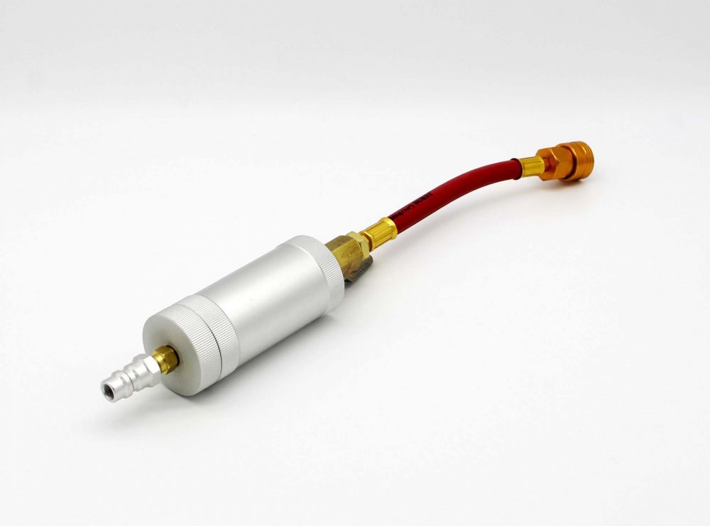Заправочный цилиндр служит для заправки нужного количества масла в систему кондиционирования, а также UV красителя. Устройство цилиндра позволяет его использовать двумя способами: