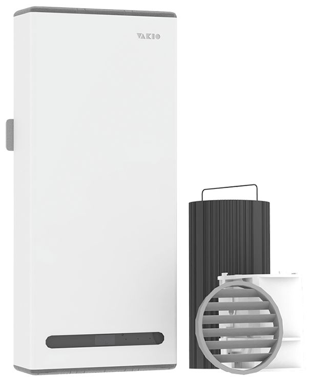 VAKIO работает по принципу дыхания. 40 секунд «вдох» — работа в режиме приточной вентиляции — во время которого происходит забор свежего воздуха с улицы, его подогрев (или охлаждение летом) и очистка. 40 секунд — «выдох» — режим отточной вентиляции, удаление углекислого газа и нагревание (или охлаждение летом) теплообменника.
